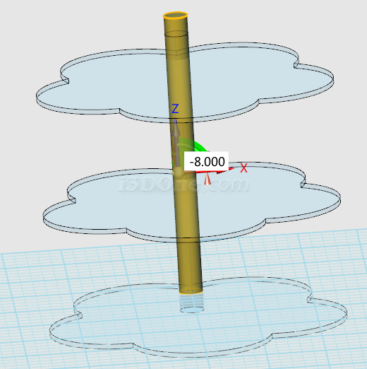 之后,選擇“移動”命令中的動態移動,向下移動8mm,如圖所示8-2.png9、選擇“基本實體”中的“球體”命令,在圓柱體的上、下面各畫一個半徑為5mm的球體,并通過動態移動,移動3mm,然后將圓柱與兩球體進行組合,得到如圖所示的圖形。
