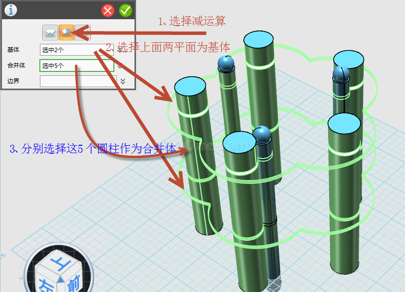 14、與第1步相同的設置后,在草圖繪制中選擇“圓形”命令,以基準平面為平面,在(0,0)為圓心,半徑30mm,作一個圓形,退出草圖,然后將其向上拉伸,穿過上面兩個面板,并選擇減運算,結果如圖所示。