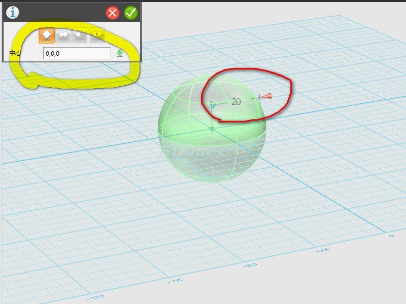 2.選擇實體工具—球體,輸入球體中心(0,0,0),半徑20。