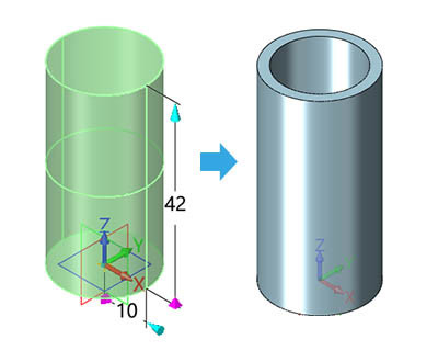 第三步,使用圓柱體,創建一個中心在0,0,0,半徑為10mm,高度為52mm的圓柱體,然后對其進行抽殼,厚度為-2mm,上下端面為開放面,完成后退出零件,如圖3所示。
