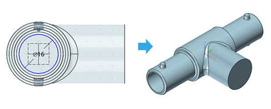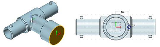 第十六步,在下圖圓柱體端面上創建一個圓柱體,半徑為16mm,長度為20mm,和原造型進行布爾加運算,如圖16所示。
