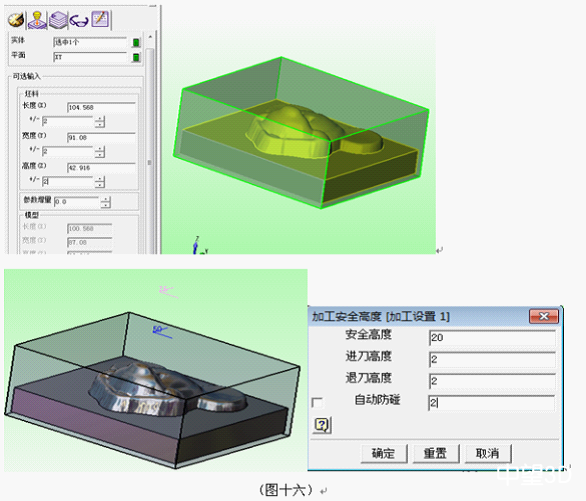 16、單擊【加工系統】工具欄的【插入坯料】按紐 ,設定加工安全高度(圖十六)